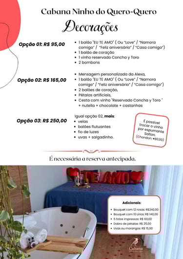 Confira nossas cestas e decorações especiais para tornar sua estadia ainda mais encantadora — seja para celebrar uma data marcante ou simplesmente surpreender quem você ama.